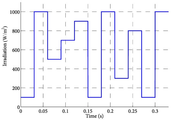 A constant temperature of 50 °C and an irradiation signal with sudden changes over seven possible values, at 0.03 s, 0.06 s, 0.09 s, 0.12 s, 0.15 s, 0.18 s, 0.21 s, 0.24 s, 0.27 s, and 0.30 s, were used to evaluate the performance of the system. See Figure 20.