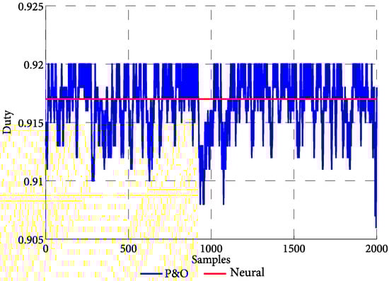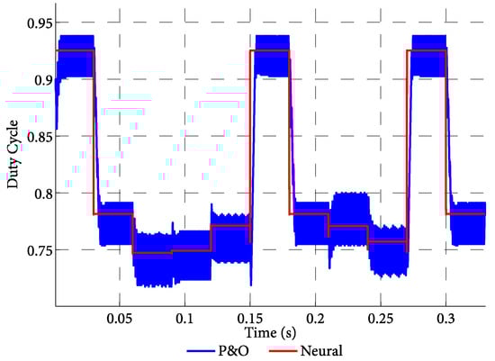 Figure 22 shows in detail the variations of the duty cycle presented with the traditional P&O algorithm in contrast to the stability shown by the inverse neural controller.
