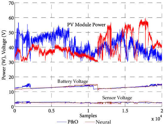 Figure 23 shows the implementation results that were obtained for the duty cycle. It can be seen that the neural controller has a constant duty cycle, while the P&O has oscillations. Figure 24 shows the results of temperature, power, battery voltage, and sensor voltage, for the two controllers. By analyzing the obtained power, between the samples 500 to 1000, it can be observed that the voltage of the sensor is practically equal in the neuronal and P&O controllers. It is logical that both of the controllers when reaching the MPP extract the same power of the PV module, however the P&O controller presented oscillations between 7 W and 10 W, while the power obtained from the neural control presents oscillations between 1 W and 2 W.