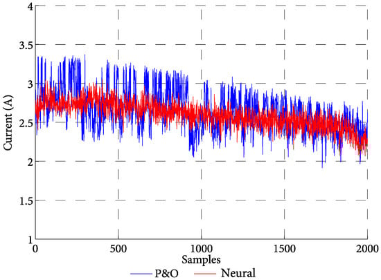 Figure 26 shows the current extracted from the PV module and Figure 27, the current flowing to the battery. In Figure 26, higher current levels are observed due to the low resistance to the charge current, in contrast to the current values that are observed in Figure 27. In both cases, greater oscillations occur with P&O when compared with the neural control.