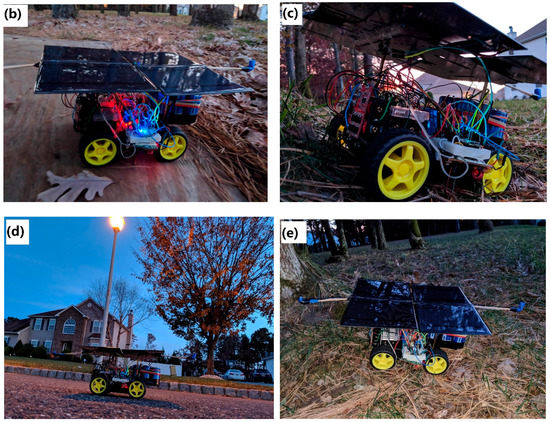Rover hardware and design. Circuitry containing RC receiver and motor driver. (a–e) Circuitry containing Particle Photon board, voltage divider for voltage measurements, toroid coil to centralize magnetic field associated with Hall sensor, balance board to power MCU, power switch relay, and battery management system for Li-ions. Overall pictures of Rover size and environmental application.