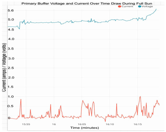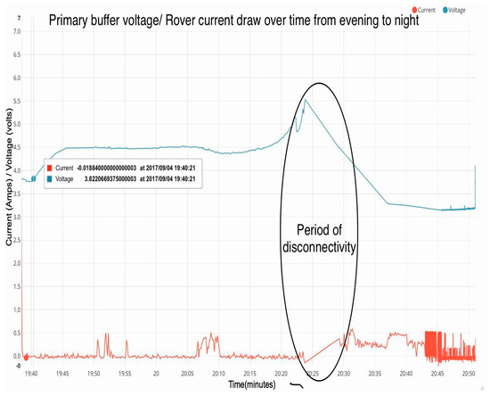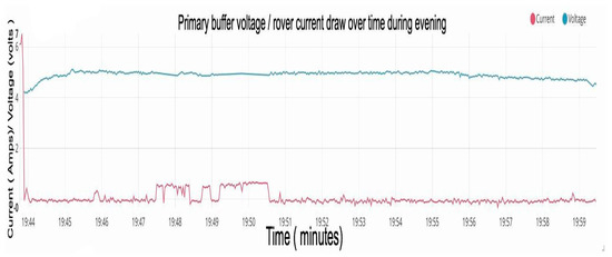 The three main sunlight conditions were full sunlight, clouded evening, and nighttime. During full daylight, the rover received the full 10 watts of power from the sun and could drive at full speed, make turns, and carry out various extravehicular maneuvers without decreasing the voltage of the motors. Figure 4 shows the voltage of the primary buffer and the current draw of the rover during testing done during bright direct sunlight. It can be noticed that the primary buffer voltage continued to increase when the current draw was high. Specifically during the full duration of the test, Current d(t) = 388.08 C while . This increase, despite losing charge to the motors, is duly noted. When the rover was tested again during clouded evening conditions during the time of sunset, different results were achieved. The primary buffer voltage remained roughly constant during periods of a minimal current draw and would barely dip when the rover was moved, as seen in Figure 5. However, perhaps most astonishing is the fact that the voltage levels increased after the rover was manually re-positioned to an area with more direct sunlight. At the time mark of 20:07 in Figure 5, the rover moved and as the sun began to set the primary buffer continued to gain voltage due to the adjustment. This uptick was due to the nearly zero current draw and improved position of the rover. As soon as the sun set entirely, the board experienced a brief internet disconnection. The voltage under pitch darkness dropped dramatically, as expected. The results of this test provide support for the need of an intelligent algorithm to maximize the rover’s power availability. Another test was completed in sunset conditions and is displayed in Figure 6. This test corroborates the path from Figure 4 during the evening luminous conditions; that being a standard almost linear voltage level even during small movements. These outdoor tests express that the rover can gain energy from the panels during the evening hours approaching darkness.