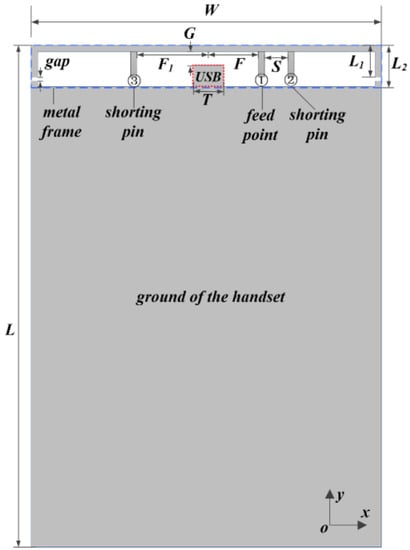 Figure 1 presents the geometry of the proposed T-shaped antenna. The antenna was designed using the metal frame of the handset as the main radiator. A feed point (labeled ①) and two shorting pins (labeled ② and ③) were placed around the USB connector to excite the structure, working as Modes 1, 2, 3, 4, and 5, respectively. The USB connector with a width of T was located in the center of the metal frame. F and F1 represent the distance of points ① and ③ away from the USB connector, respectively. The space between point ① and ② is S. The working principles of the radiation characteristic will be discussed in detail in Section 3. The size of the handset was set to W × L with 2 mm gaps separating the metal frame and the ground plane. The gaps were filled with dielectric ( = 2.2) to connect the metal-frame together. Therefore, the length of the metal frame could be considered as (L1 + L1 + W). The distance between the metal frame and the ground was L2. All these parameters are reasonable for practical smartphone antenna design and were simulated and optimized by the commercial electromagnetic software, CST Microwave Studio® 2015. The detailed parameters are tabulated in Table 1.