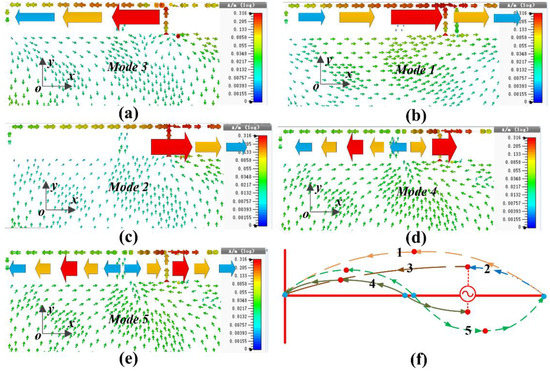 Surface current of the first five modes of the structure: (a) Mode 3; (b) Mode 1; (c) Mode 2; (d) Mode 4; (e) Mode 5; (f) all modes.