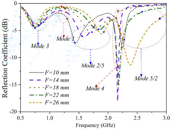 As mentioned above, the placement of the feed point can adjust the resonant frequencies of both the lower and the higher bands. Different values of F were simulated by CST Microwave Studio® and the impedance of different F values embodied in a Smith chart is presented in Figure 4. As the feed point moved away from the USB connector (and F increased), the knot in the Smith chart became smaller first, then larger again. When F = 18 mm, the knot disappeared, and this point was also where Mode 2 and Mode 5 reverse positions. When F < 18 mm, the sequence of the characteristic modes was Mode 3–Mode 1–Mode 2–Mode 4–Mode 5; if F > 18 mm, the sequence became Mode 3–Mode 1–Mode 5–Mode 4–Mode 2. The knot represents resonance at the higher band. A smaller distance away from the center of the Smith chart means a better resonance. Moreover, as the |S11| of different values of F illustrated in Figure 5, the value of F would affect all frequencies in both the lower and higher bands. The value of F was finally set at 14 mm, which rendered a better resonance in the higher band, as shown in Figure 6.