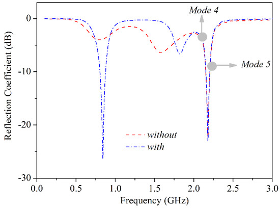 Another shorting pin ② could be inserted to make the lower band have a better resonance. Figure 6 is a comparison of |S11| with and without the shorting pin ②. One can see that the curve with the shorting pin ② has a better resonance phenomenon at the lower band, while its second resonance moves to a higher frequency, which is able to cover the bandwidth of 1710–2690 MHz. Figure 7 shows the Smith chart with and without the shorting pin ②. It can also be seen that the insertion of the shorting pin ② helped to squeeze the knot of the lower band without destroying the higher band resonance (Mode 4 and Mode 5).