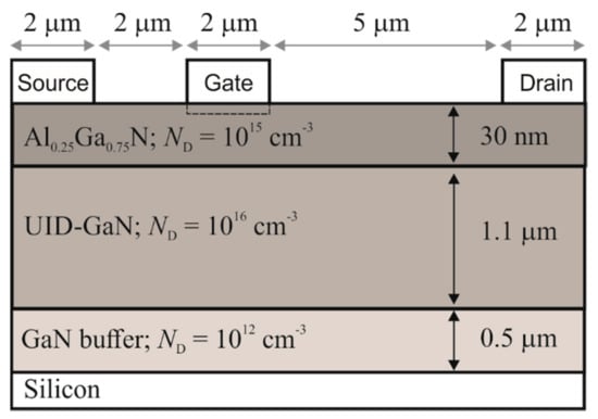 The device geometry and material composition are drawn in Figure 1. Corresponding donor doping concentrations, ND, are also indicated. Notice that below the AlGaN barrier and GaN channel, 30 nm and 1.1 μm deep, respectively, a practically undoped GaN buffer (with similar electrothermal performance) substitutes the transition layers for simulation purposes.