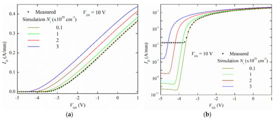 Then, for any trap concentration, Nt, ranging from 1019 cm−3 to 3 × 1020 cm−3, transconductance (∂ID/∂VGS) in strong inversion regime is numerically reproduced, as Figure 2a shows, where measured (with symbols) and simulated (with lines) transfer characteristics are represented in linear scale. Notice that, for a trap concentration of 1019 cm−3, the measured transfer characteristics above threshold voltage are well predicted, additionally.
