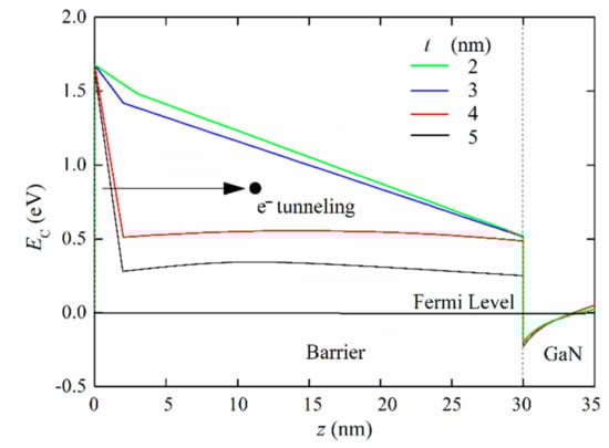 To solve the problem of the adjustment of this gate leakage current behavior, without deteriorating the transfer characteristics in conduction regime (with gate-to-source voltage, VGS, above threshold voltage), non-local tunneling incorporating FN emission through the gate is activated in simulations [,], with the donor layer thickness for traps, t, being varied from 2 nm to 5 nm. Figure 3 shows the resulting conduction band energy minimum profile below the gate (EC, with colored lines), in depth (z). Notice how the transversal electric field (|∂EC/∂z|) under the gate drastically increases with the thickness of the trap layer, deriving a higher leakage current by tunneling.