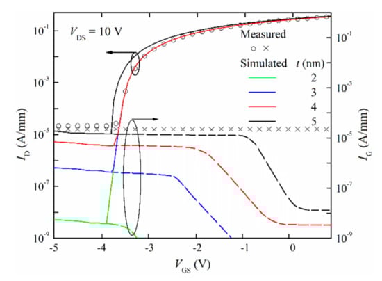 This effect is observed in Figure 4, where transfer characteristics (left axis) and corresponding gate current (right axis) are represented. Note that, in an off-state regime, gate and drain measured currents (with symbols) coincide, demonstrating that all leakage current through the gate is collected by the drain terminal. Numerical simulation data (with lines) show that the subthreshold current increases with the trap layer thickness, and, for a value of 4 nm, the difference between measured and simulated subthreshold current is reduced in more than five orders of magnitude, with a correct prediction in strong inversion regime being maintained. Higher values (e.g., t = 5 nm) are not suitable because transfer characteristics deteriorate, since the threshold voltage suffers a considerable reduction not observed in measurements.