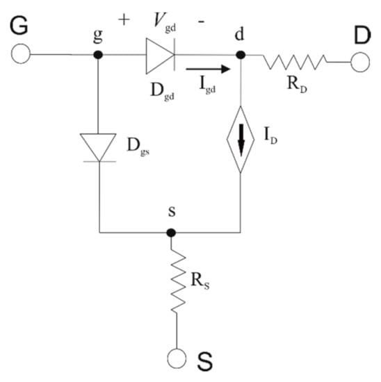 The large signal scheme of the compact model, which is implemented in the electrical simulator ADS (from Keysight) employing the industry modeling language for analog circuits and devices Verilog-A, is presented in Figure 5, where the Schottky gate is modeled through diodes Dgd and Dgs, from gate-to-drain and gate-to-source intrinsic nodes, respectively.