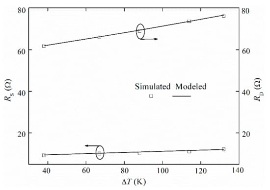 Parasitic resistances in source and drain terminals, RS and RD (temperature-dependent), which are decisive for the DC performance evaluation of HEMTs, are incorporated with data extracted from simulations. Both of them, particularly RD, are higher as the device temperature increment rises, as Figure 6 shows (squares). A second-order polynomial is enough to fit this dependence (solid lines), that is RS/D ≈ a + b∆T + c∆T2; fitting parameters, a, b and c, are indicated in Table 2.
