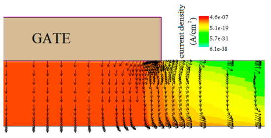 The gate leakage current could flow from gate to drain terminals through the top surface of the AlGaN barrier or, vertically, crossing the barrier through the GaN channel []. Numerical simulations with TE, PF and FN emissions show that the second case is taking place in the HEMT under study, as Figure 7 indicates for reverse-biased gate (VGS = −5 V and VDS = 10 V), with the current density flowing through the barrier, under the gate, by the drain side.