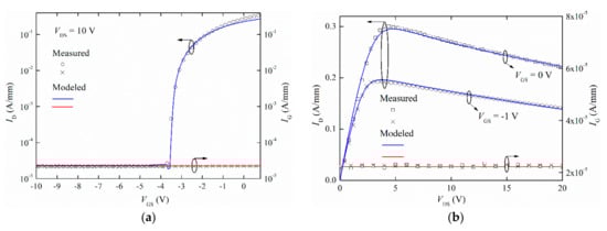 Thus, the resulting modeled (dashed line) and measured (symbols) transfer characteristics in saturation regime (left axis, with VDS = 10 V), in logarithmic scale, are represented in Figure 8a, together with the corresponding gate current (right axis) in a similar way. A good correspondence between modeled and measured data has been achieved, with an average relative error of 8.3% (around VGS = 0 V) and 0.6%, respectively, for the drain and gate current. And, again, drain and gate currents in subthreshold regime do match. Similarly, measured and modeled output characteristics (left axis), with the corresponding gate current (right axis), are represented in Figure 8b for different gate voltages. A good agreement is, again, observed, with an average relative error of 1.8% and 1% for the drain and gate current, respectively. Therefore, our model (4) can be considered appropriate for the leakage current of GaN-based HEMTs, through the Schottky gate, within typical operation regimes.