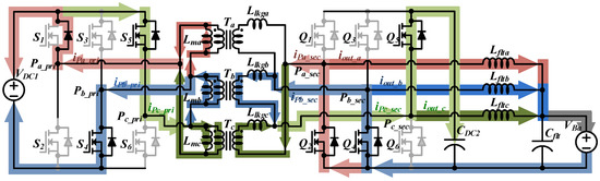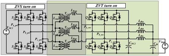 The CFFB converter is a topology that can improve this current ripple of the capacitor. The CFFB converter has an output capacitor behind the inductor filter, which reduces the current ripple of the capacitor more than the conventional DAB converters, and can also be smaller than the conventional full-bridge converter by interleaved operation. However, it is difficult to reduce the circulating current, because doing so requires an active clamp circuit that can discharge the stored energy of the transformer of the leakage inductor during the discharge, as in the bidirectional full-bridge converter. When an active clamp circuit is added to the CFFB converter, the circuit configuration of the DAB converter appears as part of the entire circuit, and the DAB converter PWM technique is available for the CFFB converter. Accordingly, this allows for a wide ZVS range, which is the advantage of the DAB [19,20,21], and a low circulating current as well as a converter configuration with low current ripple characteristics of the output capacitor, which are advantages of the CFFB converter [22,23]. In addition, since a 3-phase configuration, such as CFFB, is possible, as in a CFFB converter, it is possible to design the optimal passive element through an interleaving operation.