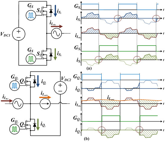However, the 3P-CFDAB converter can be analyzed as the 3-phase DAB converter from the primary side to the active clamp circuit, and the second side can also be analyzed as a bidirectional buck-boost converter. In addition, the 3P-CFDAB converter has different soft switching characteristics on the primary and secondary sides because of the structure, as shown in Figure 1. In the case of the primary side switching devices, there is a voltage source in front of the half bridge, as shown in Figure 2a, and alternating current flows through the node with the same frequency as the switching frequency. Because of this alternating current, a negative current flow through the diode in the lower switch when turning off the upper switch, at this time, can then operate ZVS by turning on the switch. In the secondary side switching devices, the alternating current is received through the half bridge node as shown in Figure 2b, and the direct current is output. In each device, current flows by the difference between alternating current and direct current; as a result, the ZVT operation interval occurs [24].