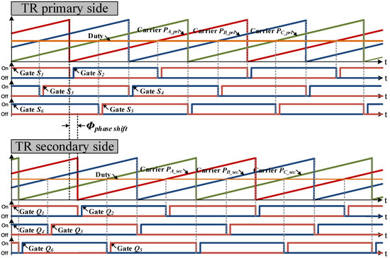 Figure 3 shows modulation technique and switching operation of the 3P-CFDAB converter. As shown in Figure 3, the switching devices of the primary side are modulated by three carriers with 120 degree phase shifting. The switching devices of the secondary side are modulated by three carriers which are shifted by ϕ in the primary side carriers, and duty ratio. Also, switching devices of each phase perform a complementary operation with an interval that does not turn on the upper and lower switches during the dead-time.