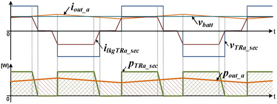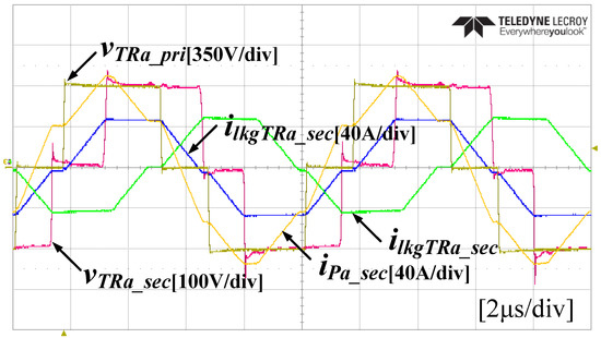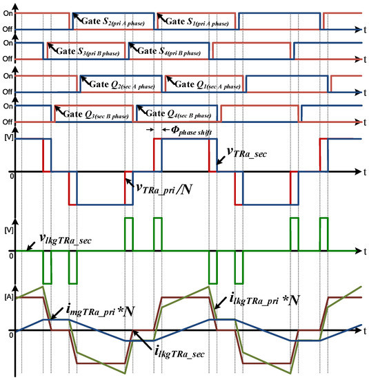 If the phase is shifted with the same ratio on the primary and secondary sides, as shown in Figure 4, there will be a voltage difference between the primary and the secondary sides, and this voltage difference is applied to the leakage inductor of the transformer. As a result, there will be a voltage difference between vTRa_pri/N and vTRa_sec, and this voltage difference (vlkgTRa_sec) is applied to the leakage inductor of the transformer. If the voltage of the secondary DC-link (VDC2) and the primary DC -link voltage (VDC1) divided by the turn ratio are the same, vlkgTRa_sec will be zero voltage because there is no difference in voltage between the primary and the secondary sides. Then, the leakage inductor is charged with voltage only in the area where the phase shift occurs, and ilkgTRa_sec, which is the current of secondary side transformer, will increase at the area.