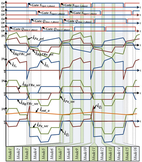 Figure 4 and Figure 5 show the mode analysis and waveforms of the 3P-CFDAB converter based on primary and secondary side phase currents by applying the phase shift technique. The 3P-CFDAB converter consists of a primary and secondary line voltage applied to the transformer, as shown in Figure 1 The phase current iPa_sec consists of both ilkgTRa_sec and ilkgTRc_sec which are the currents of the secondary side phase A and C transformer.