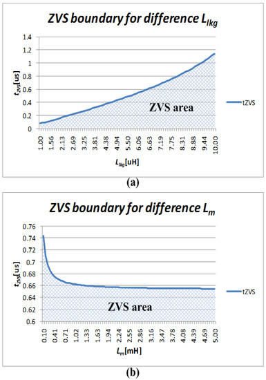Figure 9 shows the area of the ZVS depending on the variability in the leakage and magnetizing inductance. The ZVS turn on will appear when a dead time less than that in the graph in Figure 9 is applied. As shown in Figure 9a, the larger the leakage inductor is, the longer the ZVS time is, and the smaller the magnetizing inductance is, the relatively longer the ZVS time is. In addition, it can be seen that the ZVS time does not vary significantly after the magnetizing inductance has increased by a certain amount, as shown in Figure 9b As shown in Figure 9a, the ZVS time is increased proportionally to the value of leakage inductance, however, if the leakage inductance increases, the output current decreases in an inversely proportional manner. Therefore, the leakage inductance should be selected by taking into account the maximum output current and the ZVS time.