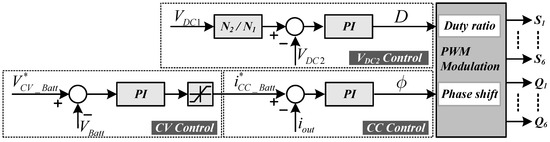 Figure 11 shows the proposed control block diagram of the 3P-CFDAB converter applied to simulation and experimental. This consists of the voltage controller for the clamp capacitor and the current controller for controlling the current of battery. The reference value of the clamp capacitor voltage is calculated by the DC voltage of the primary side and turn ration of transformer. And then, the PWM is implemented by using the output of the PI controller. The controller for CC-CV control consists of two blocks. It also consists of two controllers for the CC-CV control of the battery current. The CV controller generates a current reference value for CC control. And, the CC controller is output as the phase value for the PSM control.
