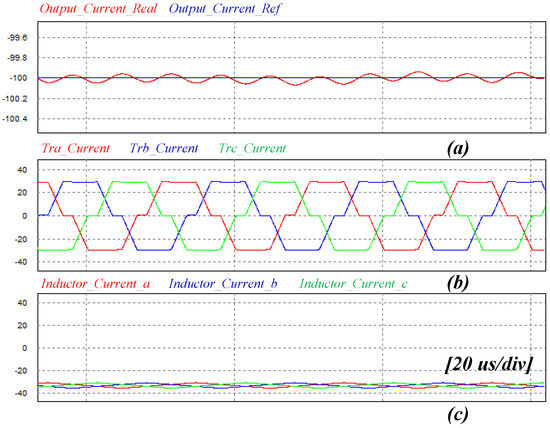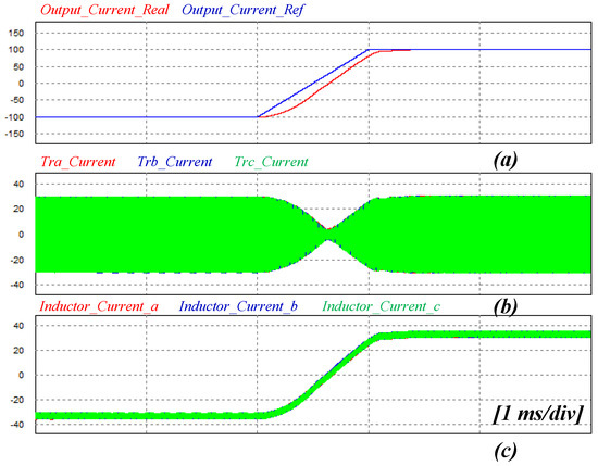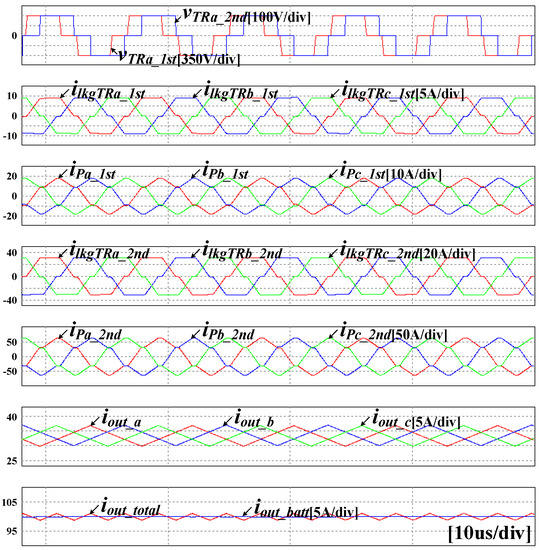 Figure 14 shows the results of the charging and discharging simulation. This shows the real output current and reference current, the current of the secondary side three phase transformer, and the current of the interleaved three phase inductor. It can be seen that the discharging operation that outputs the current of negative 100 A transfers within approximately 1 ms to the charging operation that outputs the current of positive 100 A.