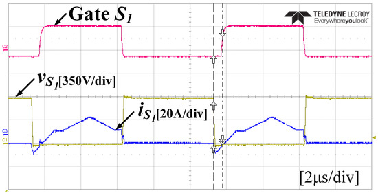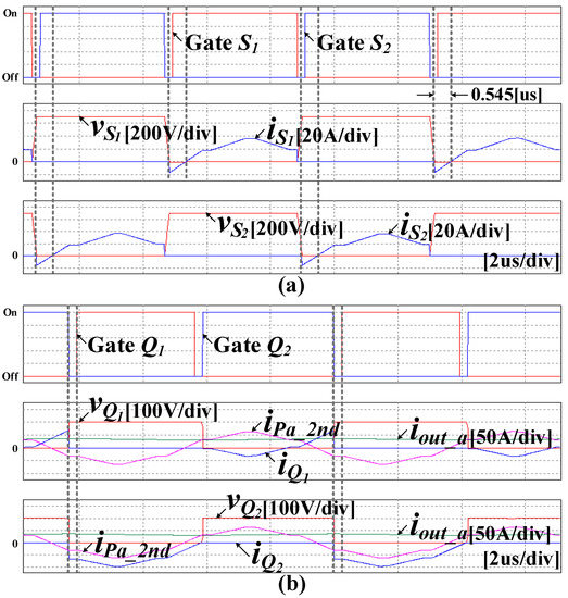 Figure 20 shows the ZVS turn-on experimental waveforms of the primary side devices. As with the simulation, soft switching is achieved at the intervals where negative currents are formed.