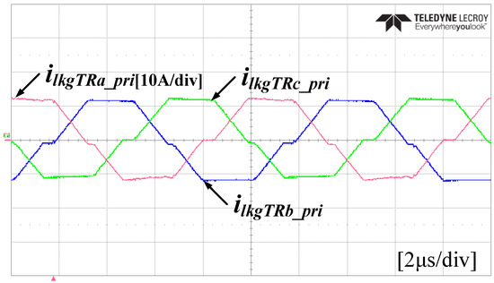 Figure 12 shows the key waveforms of the 3P-CFDAB converter. As in the simulation results, the 3P-CFDAB converter produces the primary and secondary side currents by shifting the phase of the voltage at the primary and secondary sides of the transformer. For the current of the primary side transformer, it can be seen that the magnetizing inductance current produces some inclination compared to the secondary side transformer current. The primary and secondary phase currents are generated by currents of the delta connection transformer, and the output inductor current appears as a DC current with ripple components. The three inductor currents perform an interleaving operation by a 120 degree phase shift so that the output stage current appears at frequencies three times the switching frequency.