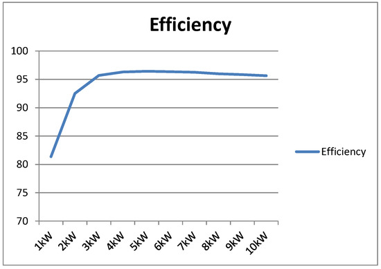 Figure 21 shows the efficiency according to the load area of the 3P-CFDAB converter measured by experiment. A lead-acid battery is used for the experiment. Capacity and terminal voltage of battery are 200 Ah and 80 V, respectively. Output current is 100 A when output power is 10 kW and an ambient temperature is maintained between 30 and 40 °C using a heat sink. Subsequently, the efficiency of the converter is about 81% at the 10% load and 92.5% at the 20% load. It also shows more than 95% efficiency from a 30% load to full load. Therefore, the proposed 3P-CFDAB converter and control method achieve high efficiency over a wide load area.