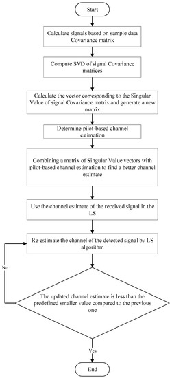 The last two terms on the right side of Equation (18) are interference signals and noise interference from other cell users. The basic principle of the ILSP signal detection algorithm is to first use the SVD channel estimation algorithm to find the initial channel value as a known condition, and use this initial value instead of the real channel value for signal detection, and then use the detected signal as a known receiving data and re-estimating the channel [29].