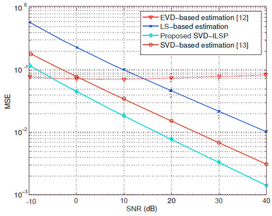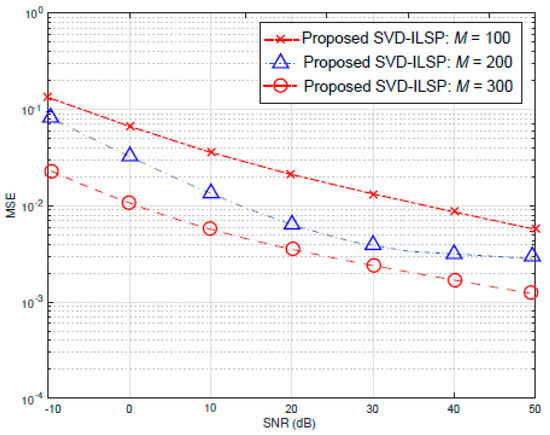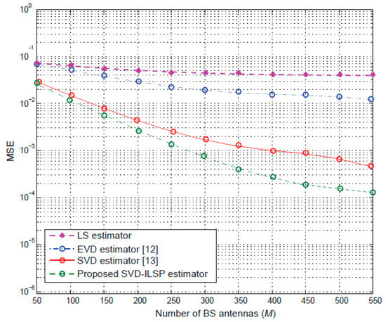 Figure 5 shows the trend graph of the MSE corresponding to the four channel estimation algorithms under a different number of antennas, taking , . As can be seen from Figure 5, with the increasing number of base station antennas, the performance of the LS channel estimation remains basically unchanged. This is mainly because the LS channel estimation algorithm is seriously polluted by the pilot. As the number of antennas increases, the MSE of the EVD-based semi-blind channel estimation algorithm is significantly reduced. This is because as increases, the progressive orthogonality between the column vectors of the channel matrix gradually increases, so the interference between users is gradually weakened. In the case of pilot contamination, the channel estimation performance of the SVD algorithm is better than that of the EVD algorithm and the LS channel estimation algorithm as the number of antennas increases, and the SVD algorithm combined with the ILSP is better than the single SVD when the number of antennas increases. This is mainly because the proposed improved algorithm utilizes the iterative idea to better optimize the channel estimation value, thereby improving the accuracy of channel estimation. It can also be seen from the Figure 5 that as the number of base station antennas increases, the MSE slightly decreases, which is mainly due to the large-scale fading coefficient of the user in the system, that is, the position of the mobile terminal in the cell.