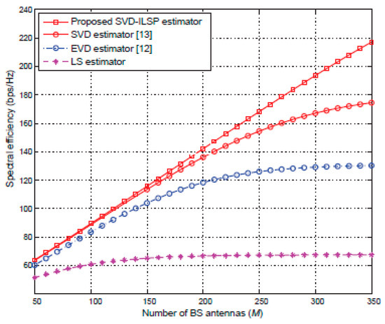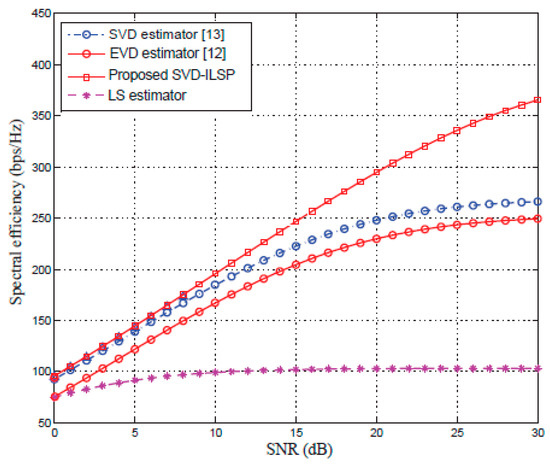 Figure 6 compares the spectral efficiency (SE) of the proposed joint SVD-ILSP algorithm with EVD and SVD-based semi-blind channel estimation algorithms under different SNR conditions. As can be seen from Figure 6 when the SNR increases, the SE of all the algorithms increases. The LS scheme shows poor SE and it has a slight variation with SNR. The EVD estimator shows better SE than the LS while the SVD has improved SE than both LS and EVD but lower than the proposed SVD-ILSP algorithm. Furthermore, the rate gap between the proposed SVD-ILSP algorithm and other algorithms gets larger which clearly indicates that the proposed algorithm shows superior SE performance under high SNR conditions as well as low SNR values which makes it attractive candidate from a practical perspective.