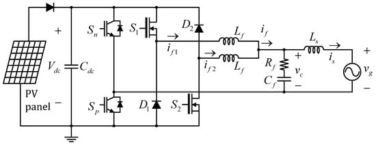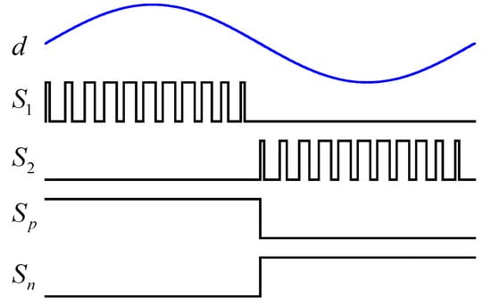 Figure 1 shows the circuit structure of the three-level dual-buck PV inverter. In order to reduce the power stage loss, the dc-link is directly fed by the PV panel with the blocking diode. As the maximum power point tracking (MPPT) performance is necessary, the dc-link voltage is indirectly regulated by controlling the output power of the inverter at the given irradiation conditions. The LCL filter with the damping resistor Rf is composed of the inverter- and grid-side inductors, Lf and Ls, and the filter capacitor Cf. Unlike traditional full-bridge inverters, the three-level dual-buck inverter has two switching stages that operate with the low and high frequency. In the figure, the pair of the switches Sp and Sn operates at grid switching frequency and the other pair of switches S1 and S2 operates at high switching frequency. The main role of low frequency switching side switches is to determine the polarity of the output voltage. The switches that operate at the high frequency switching side regulate the magnitude of the grid current. By considering this, the modulation signals of the three-level dual-buck inverter [] are represented as illustrated in Figure 2.