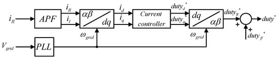 The d–q current control structure of the single DBI is shown in Figure 5. The output duty reference of the current controller and the feed-forward are added together to control the DBI system. In order to compensate the disturbance arising from the utility grid voltage, the feed-forward term generate a duty reference as follows:
