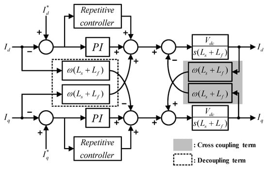 In (7), the coupled terms iq and id are existent in the d- and q-axis. It has been well-known that these coupled terms deteriorate transient responses. As the parasitic resistance Rs and Rf of the filter inductor Ls and Lf are small enough not to affect the plant transfer function []. Therefore, Equation (7) can be expressed simply as follows: