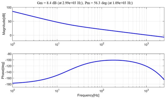 Equation (11) also takes into account the unit delay caused by the digital control. The bode plot of the designed PI controller is shown in Figure 7. From the result of the frequency response curve, the bandwidth is 1.09 kHz and the phase margin is 56.3 deg. The gain of PI controller, which consisted with Kp and Ki, had been selected as 0.018 and 2, respectively.