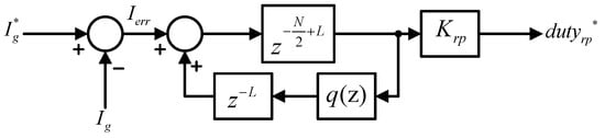 Generally, the grid-connected inverters mainly undergo the output current distortion containing odd harmonics. In order to compensate the harmonics, the loop-gain of the current controller should have extremely high gains at individual harmonic bands. With traditional proportional-integral (PI) control approaches, it is very hard to satisfy the conditions above in wide frequency ranges []. In this view points, the use of repetitive controllers is a very good solution to achieve the output current with a very low total harmonic distortions (THD). Repetitive controllers are based on internal model principle [,,]. Hence, if the periodic errors are continuously repeated, the reference tracking performance can be excellent with very high accuracy in the closed-loop control system. Because of this feature, a repetitive controller is paralleled to the traditional PI controller to reduce the steady-state error [].