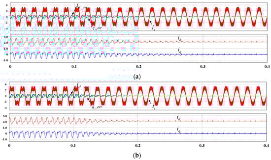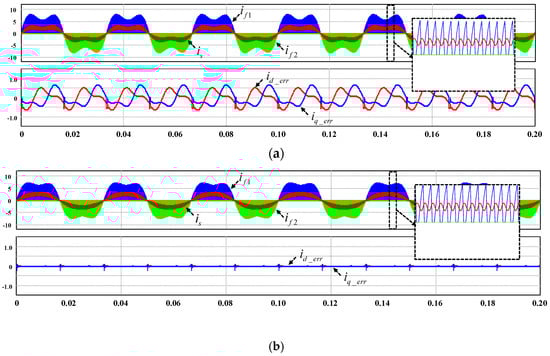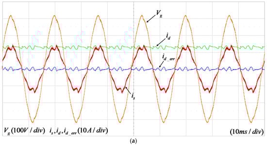 Figure 12 shows the simulation results of the current control under a light load condition, 300 W. For simulations, the power electronics simulation package PSIM from Power SIM was utilized. The parameters used in the simulation are summarized in Table 1. As can be seen in the figure, and are operated in DCM. Apparently, using only the PI controllers cannot compensate the current distortion as shown in Figure 12a. The periodic error caused by the DCM operation not only worsens the THD, but also deteriorates the power tracking accuracy. The second-order harmonic component is dominantly detected in the SRF. However, once the proposed repetitive controller is applied, the current error in the SRF is almost perfectly cancelled out, as can be seen in Figure 12b.