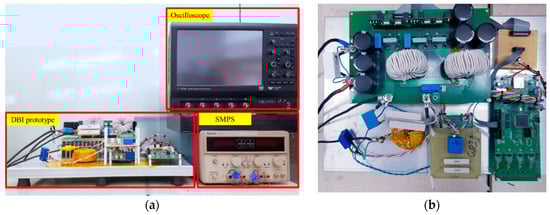 Experiments were conducted to verify the effectiveness of the designed control strategy. The same parameters expressed in Table 1 were employed. Figure 14 illustrates the experimental setup of the DBI. For the DBI’s switching devices, silicon carbide (SiC) MOSFET C3M0065090D manufactured from Cree (Durham, NC, USA) were employed. Although the conduction loss seems higher than other optimized devices, the body diode of C3M0065090D was utilized for freewheeling diodes for testing purpose. For controller implementation, a TMS320F28335 digital signal processor (DSP) manufactured from Texas Instruments (Dallas, TX, USA) was used. The in-house designed DSP board has the additional circuits for digital-to-analog converter (DAC) to monitor the internal variables in the DSP. The dc-link and the grid voltage and the grid current are measured by using LEM’s (Geneva, Switzerland) LA55-P and LV25-P.