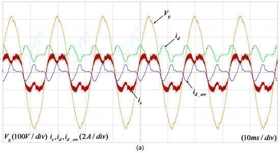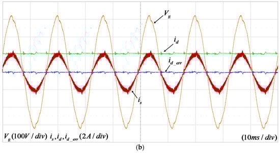 Figure 15a shows the experimental result of the current control using the PI controller under 300 W operating condition. Here, id and id_err are monitored with the DAC in the DSP board. As shown in the figure, the third harmonic component in the output current becomes dominant as a result of the DCM operation with the traditional PI control strategy. The THD of the output current is calculated as 35.75% in this case.