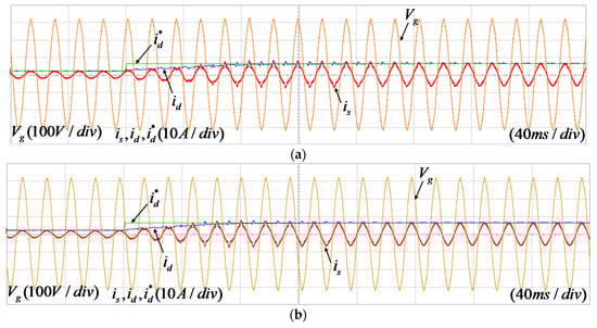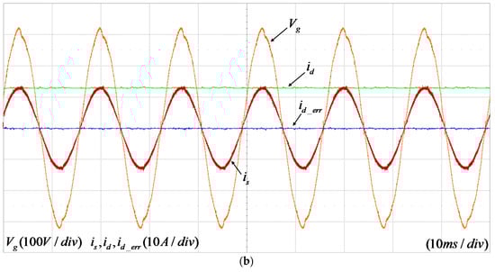 The proposed controller in Section 3 was implemented. The repetitive control gain Krp is chosen as 0.003. In fact, this value is different with the analysis taken in the previous section. It is supposed that the sensing noise, the non-ideal switching characteristics of the switching devices, and the digital propagation delay cause the selection of a lower gain compared with the simulation results.