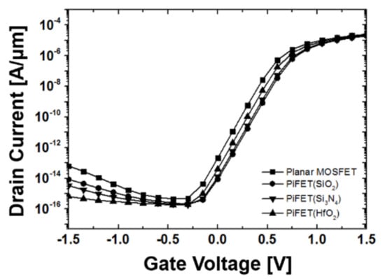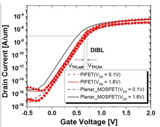 The threshold voltage is estimated based on the constant current (10−7 A/μm) method. The VTH in the PiFET, according to VDS, is higher than that in the planar MOSFET, meaning the PiFET has the better DIBL characteristics. We also found that the PiFET has a lower off-current than that in the planar MOSFET when the VGS = 0 V or less.