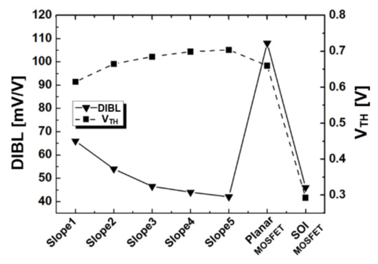 The thickness of the buried insulator of an SOI MOSFET is limited for improved electrical properties, but the buried insulator thickness of the PiFET can be easily controlled for better electrical properties [8,9]. As shown in Figure 2, buried insulator types for PiFET were divided into five slopes, in order to investigate the electrical characteristics according to the lateral encroachment levels in the channel direction. The lateral encroachment of the buried insulator of slope 5 is shorter in the group than in the other slopes. Figure 3 shows the DIBL and the threshold voltage according to the PiFET structures having various types of slopes compared to the planar MOSFET, and the SOI MOSFET at VGS = 0 V and VDS = 1.6 V. The PiFET having slope 5 exhibits better DIBL and a higher threshold voltage than the conventional MOSFETs and the PiFETs, which have gentle slopes 1–4, since the electric field near the source region is smaller. These results are also consistent with those of the planar MOSFETs and SOI MOSFETs. The smaller electric field is formed near the source region in the PiFET having slope 5, mainly because most of the electric field between the drain and the source condenses into the buried insulator, at the bottom of the drain region. This potential condensation phenomenon causes a large threshold voltage, even under low drain voltage conditions. Thus, to maintain a high VTH and DIBL, we found that the buried insulator penetrating into the drain region should be minimized below the channel region. Also, the off-currents, according to slope type of the PiFET, remained almost constant, because the electric field near the overlapped region of the gate and the drain region remains almost constant regardless of the slope type.