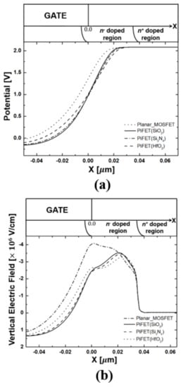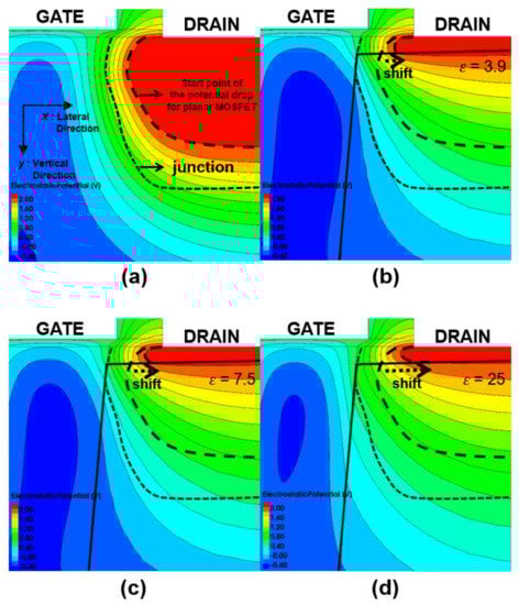 Figure 4 shows the simulation results of the potential contour near the drain region for the PiFETs and the planar MOSFET, when VGS = 0 V and VDS = 1.6 V. The electrical characteristics, according to the dielectric constants of the buried insulator, could be explained by potential condensation and potential modulation phenomenon occurring near the drain region [14]. In the potential contours shown in Figure 4b–d, the potential modulation means that the starting point of the potential drop is shifted from an n− doped region to an n+ doped region, near the drain region. The potential modulation occurs near the drain region because the penetration of the buried insulator induces a potential drop at a high-doped drain region. Namely, since the potential drop in the buried insulator of the PiFETs remains relatively constant, it results in a strong voltage change near the contact above the buried insulator. Therefore, the depletion region is formed, even in the n+ doped region, where it is difficult for the voltage change to occur in the planar MOSFET. As shown in Figure 4b–d, as the dielectric constant increases, a high drain potential edge is also pushed forward and moves toward the n+ drain region, due to an interaction increase of the boundary surface between the silicon and buried insulator. In other words, the high dielectric constant of the buried insulator deepens the potential modulation. It is found that the potential modulation results in an expanding depletion region near the n+ doped region by a high gate-fringing field. Although a high gate fringing field can cause unintended fringing field-induced barrier-lowering (FIBL) effects, reducing the channel-to-drain barrier, it can reduce the electric field across the gate oxide between the gate and drain regions [15,16]. As shown in Figure 5a, the peak of the vertical field of the overlapped region between the drain and gate of the PiFETs decreases, and is shifted from an n− doped region to an n+ doped region, due to the increased gate-fringing field. This means that the band-to-band tunneling (BTBT) in the overlapped region between the gate and the drain is reduced [17,18,19,20]. Therefore, the PiFET structure can effectively reduce the off-current by GIDL. Meanwhile, Figure 5b shows the potential drop of the PiFETs and planar MOSFET at the channel surface by potential modulation. A deep potential modulation phenomenon in the drain region can consequently contribute to improving the DIBL characteristics, by effectively blocking the electric field transmitted to the source.