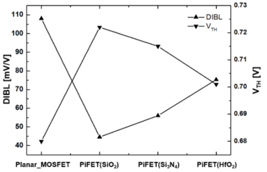 Simulation results of the DIBL characteristic of planar MOSFET, SOI MOSFET, and PiFETs, each with a silicon film thickness of 15 nm, as well as the buried insulators of the SiO2, Si3N4, and HfO2 materials.
