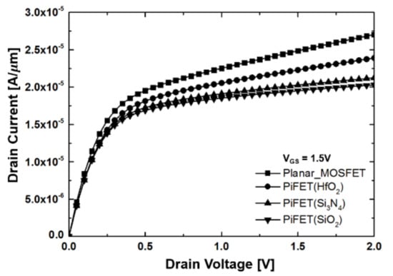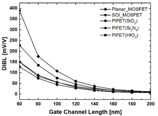 Figure 8 shows the VDS-IDS characteristics according to the dielectric constant of PiFETs. Even with the high voltage in the drain region, the potential modulation and the potential condensation phenomenon in the PiFET structure minimizes the reduction of the effective channel length. Consequently, the saturation current is kept constant compared to the planar MOSFET, and the PiFET having a low dielectric constant of 3.9 has the most constant saturation current. Figure 9 shows the DIBL characteristics, according to the gate channel lengths of PiFET, SOI MOSFET, and the planar MOSFET. As the gate channel length is reduced, the planar MOSFET and the PiFET with a dielectric constant of 25 show a dramatically increased slope with increasing DIBL, while the PiFET with a dielectric constant of 3.9 maintains a DIBL of less than 150.