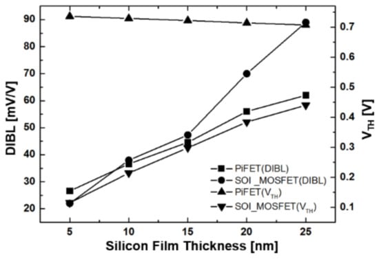 DIBL and threshold voltage dependence of silicon film thickness on the SOI MOSFET and the PiFET with slope 5.