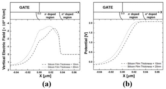 Figure 10 shows the DIBL and VTH characteristics for the PiFET, having a buried insulator of slope 5 with a dielectric constant of 3.9, according to the silicon film thickness. While the SOI MOSFET exhibits improved DIBL characteristics, the threshold voltage is drastically reduced due to the thinner silicon film thickness, which reduces the fully depleted channel region area. However, the PiFET with a thin silicon film exhibits improved characteristics in both the DIBL and the threshold voltage without a fully depleting channel region as the silicon film thickness is reduced. As shown in Figure 11a,b, these improved characteristics also occur because the starting point of the potential drop shifts to the deep n+ doped region when the silicon film thickness is 10 nm, compared to when it is 20 nm. These results indicate that the thin silicon film thickness of PiFET can also induce the potential modulation at the n+ doped region immediately above the buried insulator. Therefore, a large potential drop occurs near the drain region, and the peak vertical electric field decreases near the overlapped region between the drain and gate region, resulting from the high gate-fringing field in the case of thin silicon film thickness, as shown in Figure 12a,b. We thus found that it is possible to enhance the potential modulation phenomenon without a buried insulator with a high dielectric constant, by maintaining the thin silicon film thickness. Figure 13 shows the off-current and Gm.max, according to the silicon film thickness of the PiFET. Actually, the on-current of the PiFETs is almost constant, because the PiFET structure is not related to the area of the source region, although a small drain region limited by the silicon film thickness can slightly reduce the on-current. However, as the silicon film thickness decreases, the off-current sharply decreases. We therefore do not need to seriously consider the Gm.max reduction problem.