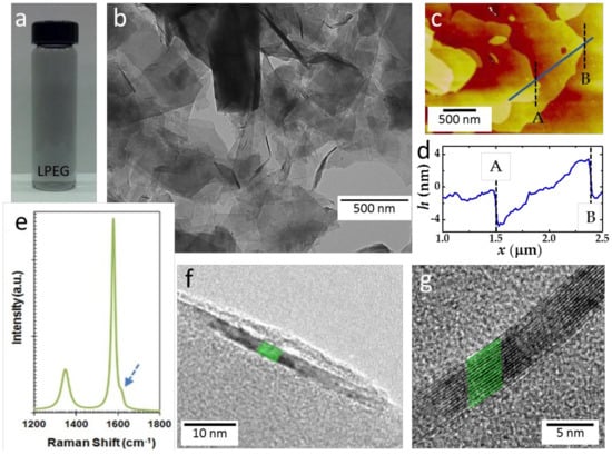 Optical characterization of the prepared liquid-phase exfoliated graphene (LPEG) sample. (a) Resulting LPEG solution following decanting of the supernatant liquid after centrifugation. (b) Transmission electron microscopy (TEM) image of dispersed few-layer flakes of prepared solution. (c) AFM image of an LPEG flake. (d) AFM height profile along the blue line shown in Figure 1c. (e) Raman spectroscopy results of LPEG. (f) HR-TEM image showing ≈8 layers at the edge of LPEG. (g) HR-TEM image showing ≈14 layers at the edge of the LPEG.