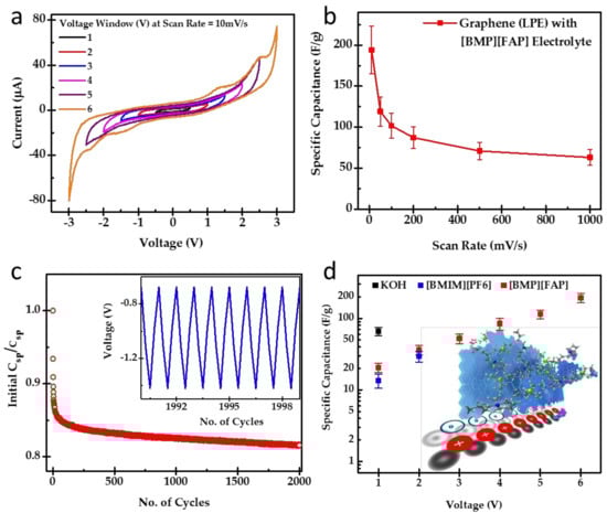Electrochemical data for LPEG in BMP-FAP. (a) Cyclic voltammetry results for all voltage windows taken. (b) Specific capacitance vs scan rate for the 6 V window. (c) Capacitance retention taken over 2000 cycles of charging and discharging. (c inset) Sample capacitor charging and discharging curves. (d) Comparative results of specific capacitance at 10 mV/s scan rate for each electrolyte and voltage window. (d inset) Schematic diagram of formation of double layer.